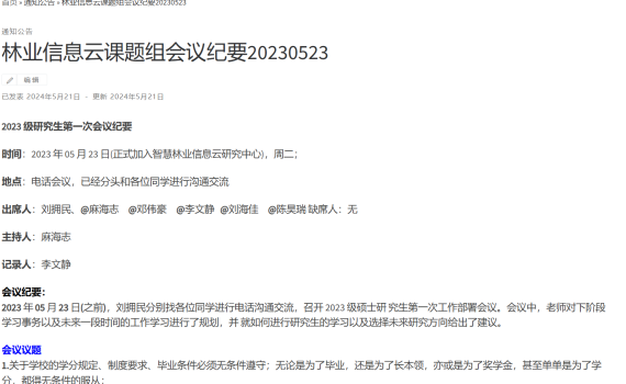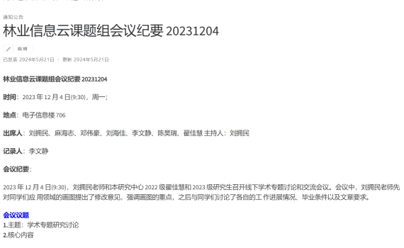 2023 级研究生第一次会议纪要 时间:2023 年 05 月 23 日(正式加入智慧林业信息云研究 […]