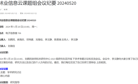 林业信息云课题组会议纪要 20240520 时间:2024 年 5 月 20 日(15:00),周一 […]