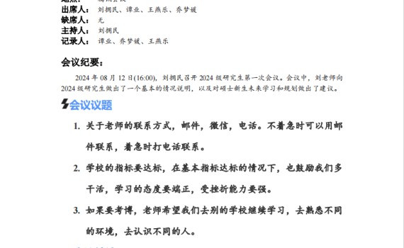 2024 级研究生第一次会议纪要 时间: 2024 年 08 月 12 日(16:00),周一召开第 […]